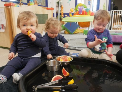 The Acorns room is where our older babies play and explore. It includes a small role play area and cosy book corner and a wonderful array of beautiful toys and resources that are at child height to fully maximise opportunities to play and learn.
